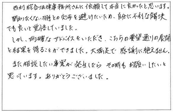 関わりたくない相手との交渉を避けたいため、自分に不利な解決でも良いと覚悟していました。しかし的確なアドバイスをいただき、こちらの要望通りの展開と結果を得ることができました。大満足で感謝に絶えません。